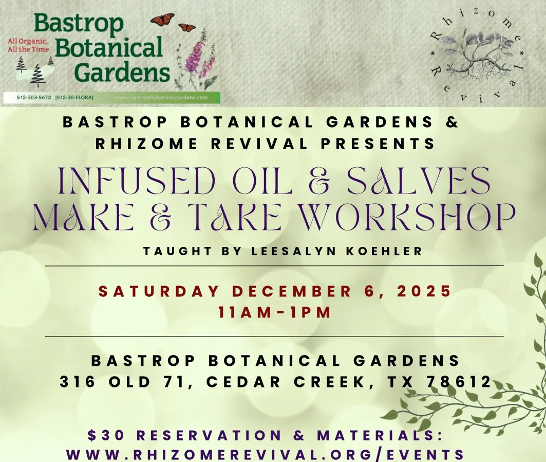 Back to All Events Infused Oil and Salves Make & Take Workshop Saturday, December 6, 2025 11:00 AM 1:00 PM Google Calendar ICS Ticket & Reservation